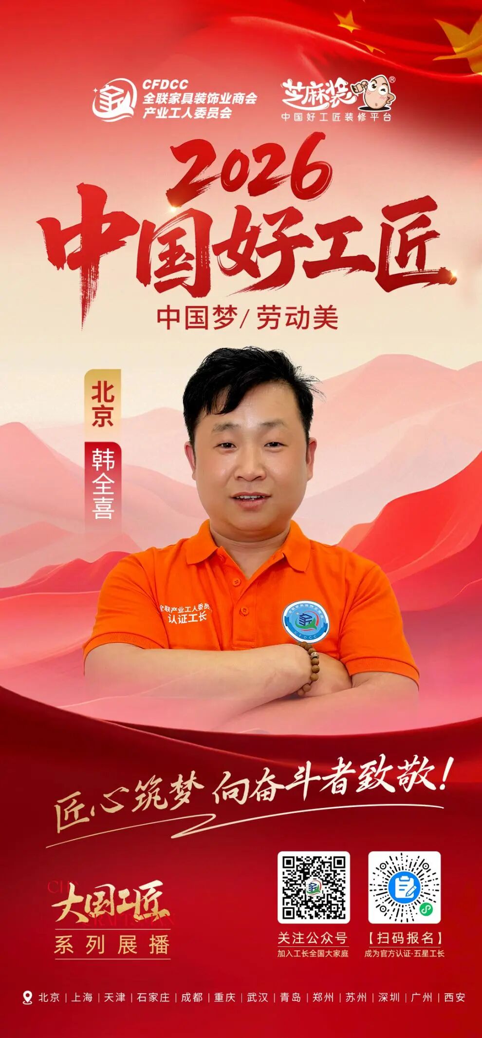 河南籍工长韩全喜,2006年赴京投身装修行业,依托家族行业积淀,从瓦工学徒起步,2013年独立创业成立公司。二十载春秋流转,他扎根家装领域,以“诚信为基、服务为魂”的信念,跨北京、天津、秦皇岛等多地服务,用精湛工艺、随叫随到的售后与真诚待人的作风,将业主变为挚友,生动诠释着新时代大国工匠精神的质朴与担当。